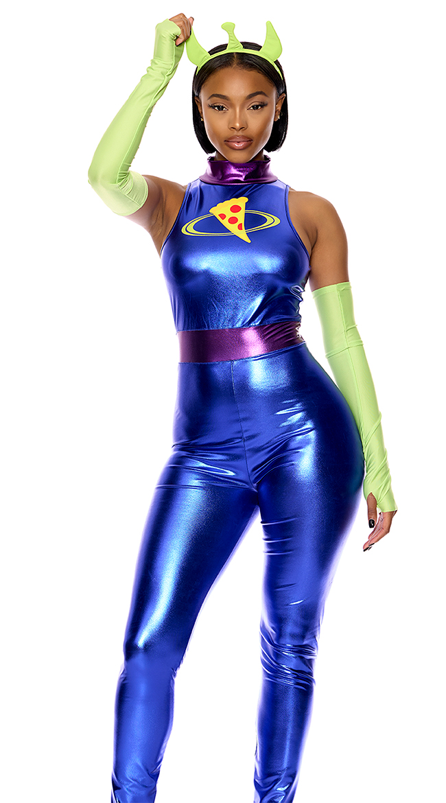 • Metallic sleeveless jumpsuit with pizza screen print graphic