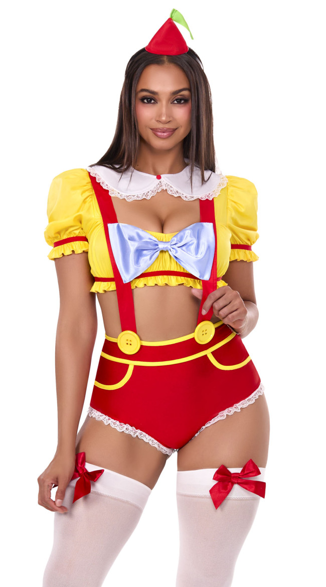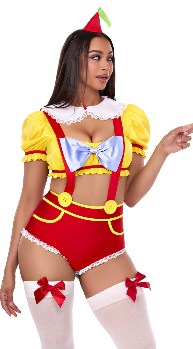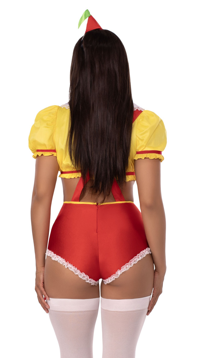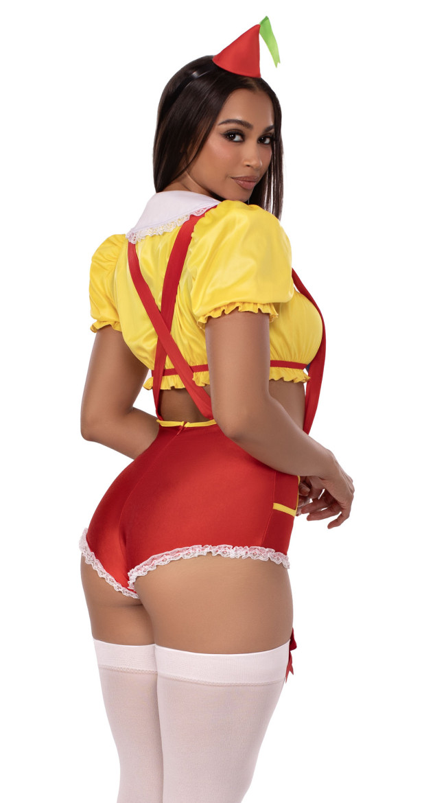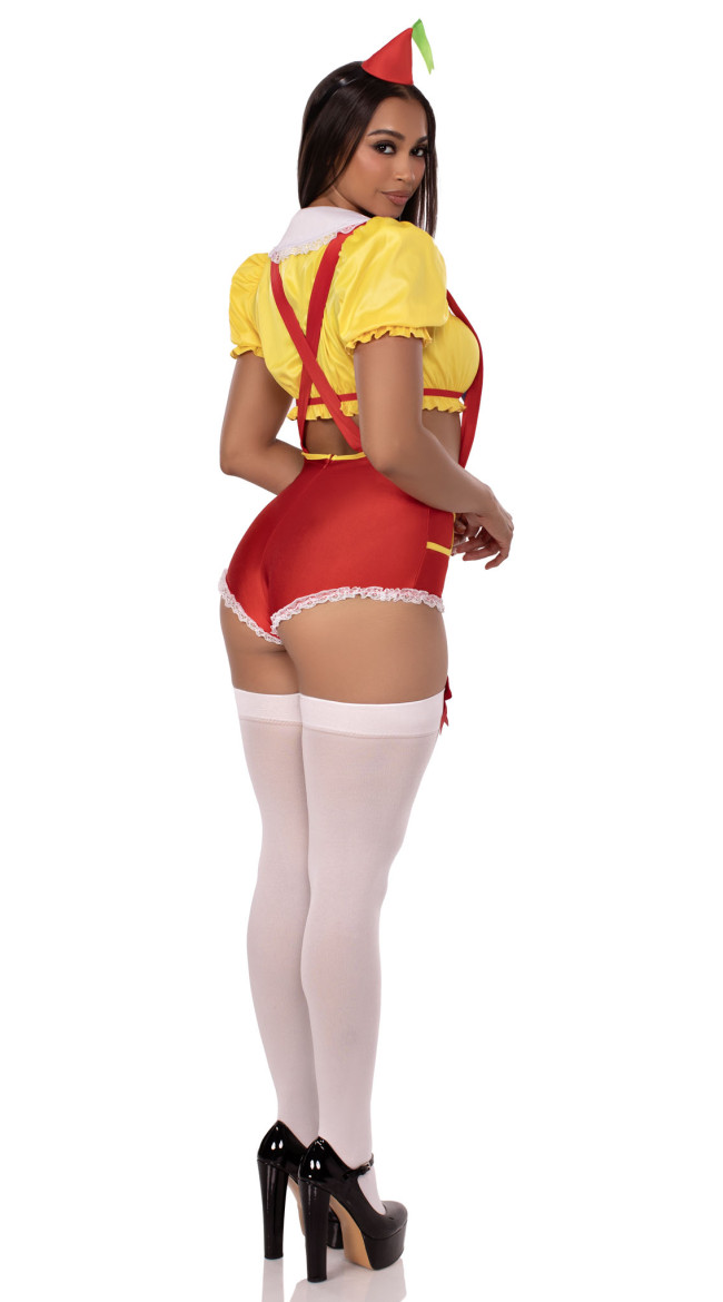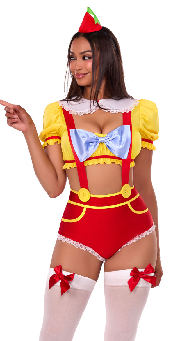 Show off your playful side in this sexy Double Trouble Darling Costume. The cropped top with puffed sleeves features bold red and yellow accents, while the suspenders and oversized bow give this look a fun, retro twist. Complete with a flirty headpiece and cheeky high-waisted bottoms, this costume is perfect for a night of unforgettable fun. (Stockings sold separately.)