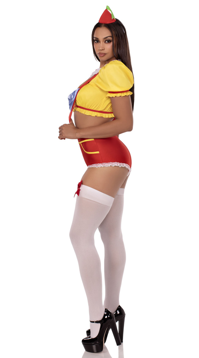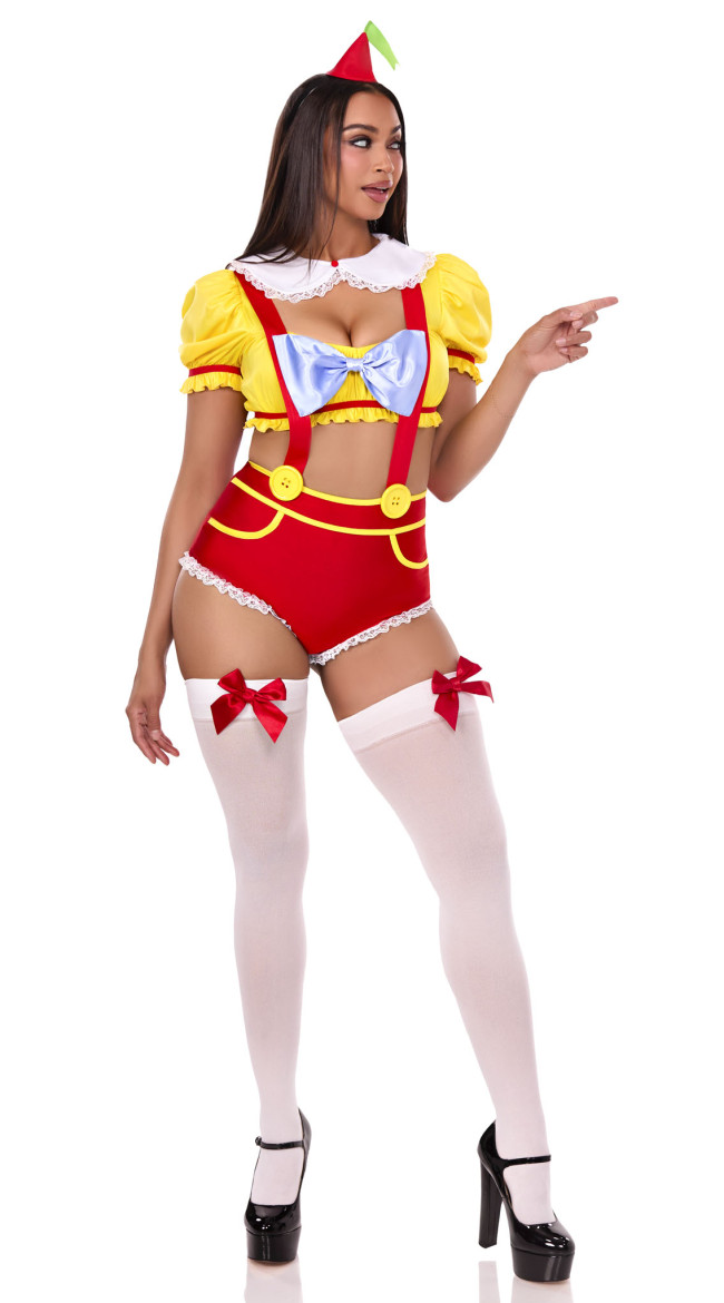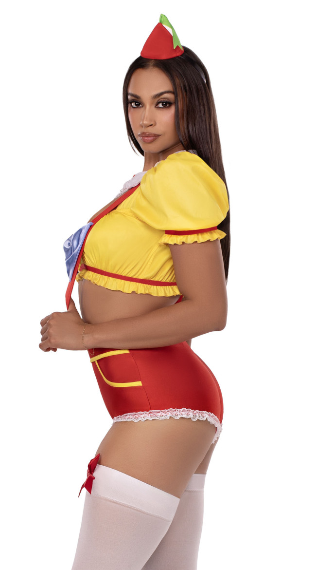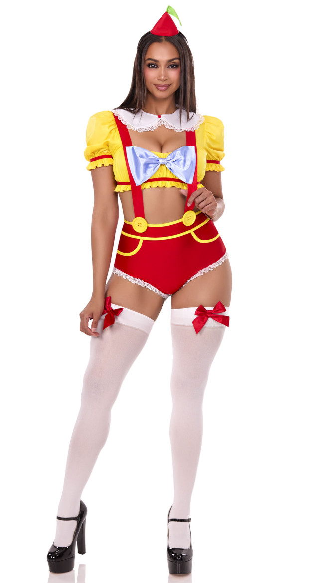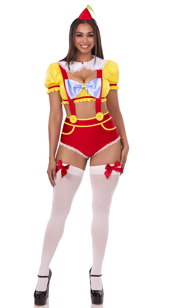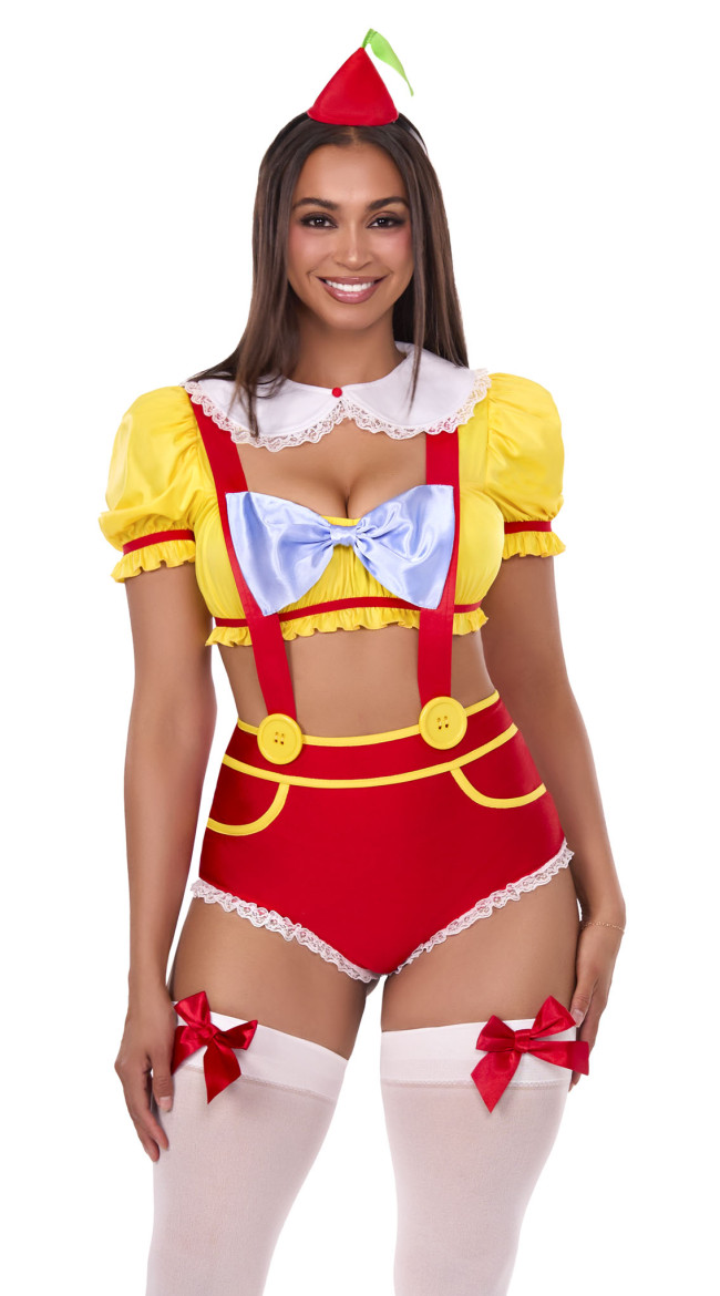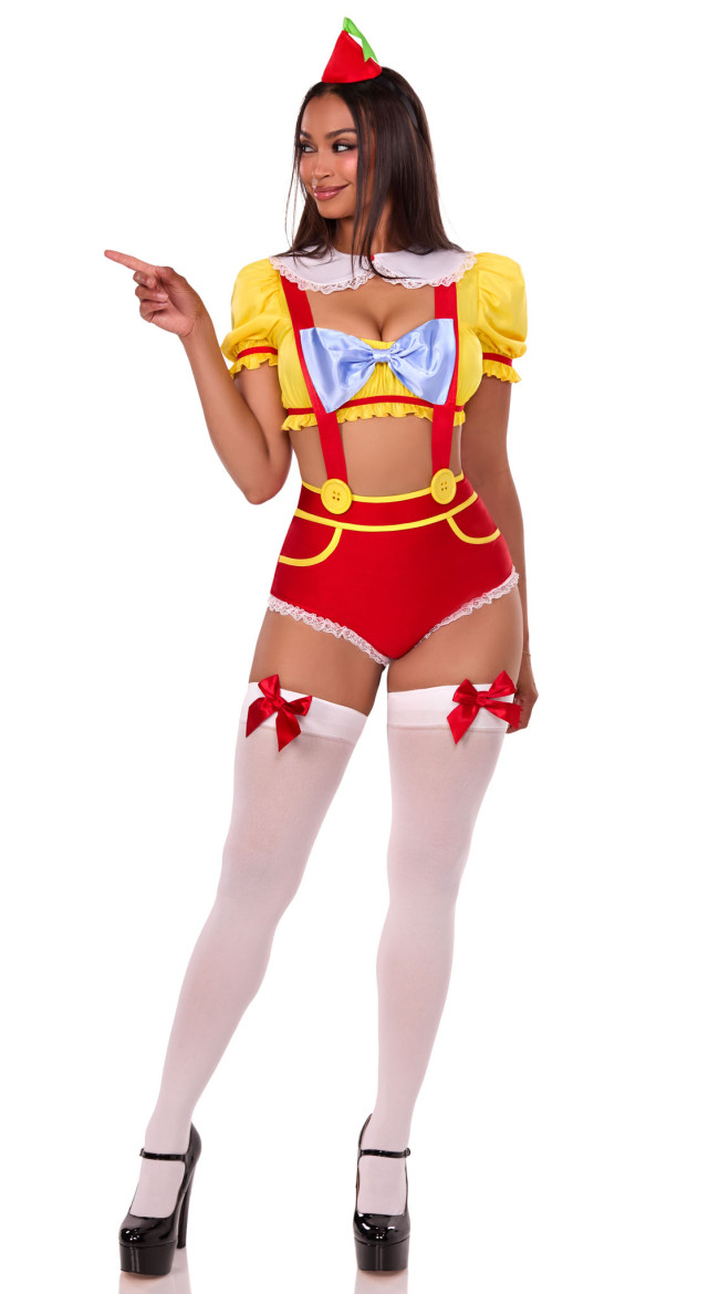 Show off your playful side in this sexy Double Trouble Darling Costume. The cropped top with puffed sleeves features bold red and yellow accents, while the suspenders and oversized bow give this look a fun, retro twist. Complete with a flirty headpiece and cheeky high-waisted bottoms, this costume is perfect for a night of unforgettable fun. (Stockings sold separately.)