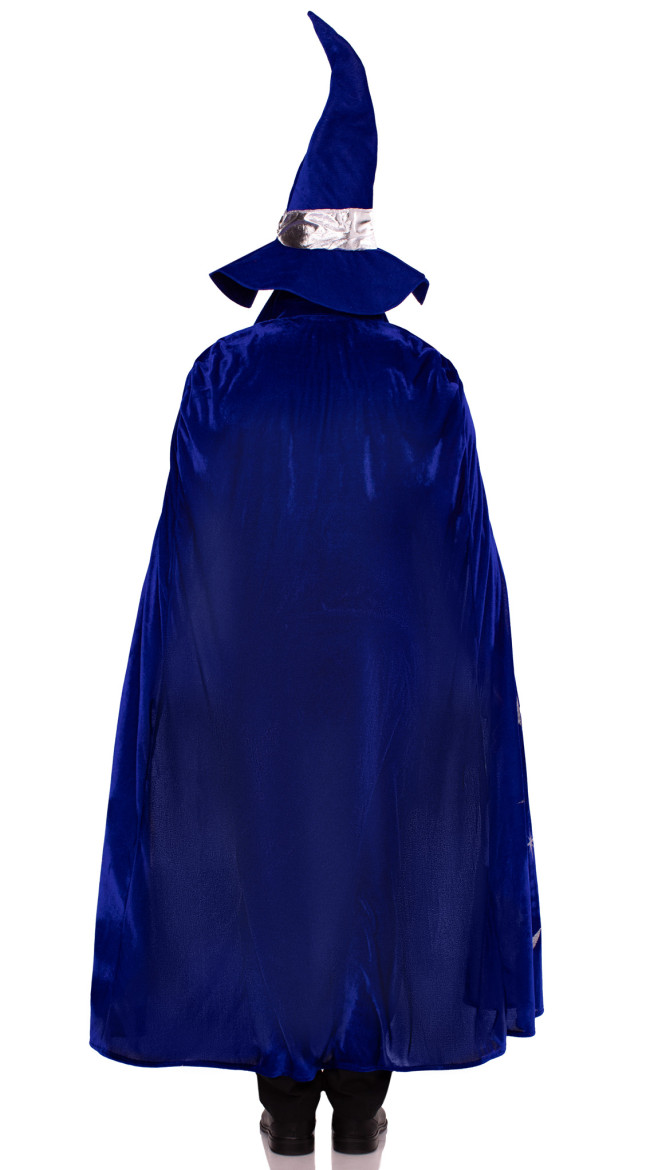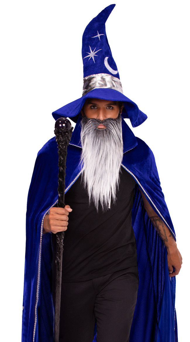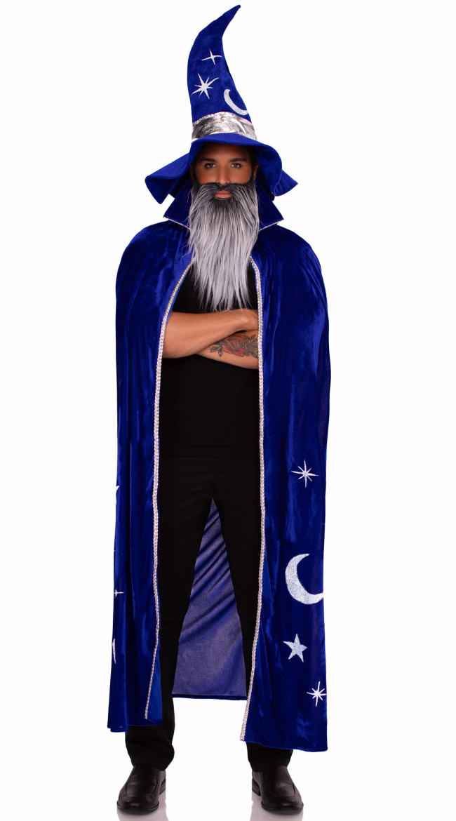 Cast a spell of mystery in this men’s wizard costume featuring a tall pointed hat adorned with silver moon and star accents, matching long cloak with shimmering trim, and a flowing gray beard for that wise, magical touch. Perfect for conjuring enchantments at Halloween or themed parties.