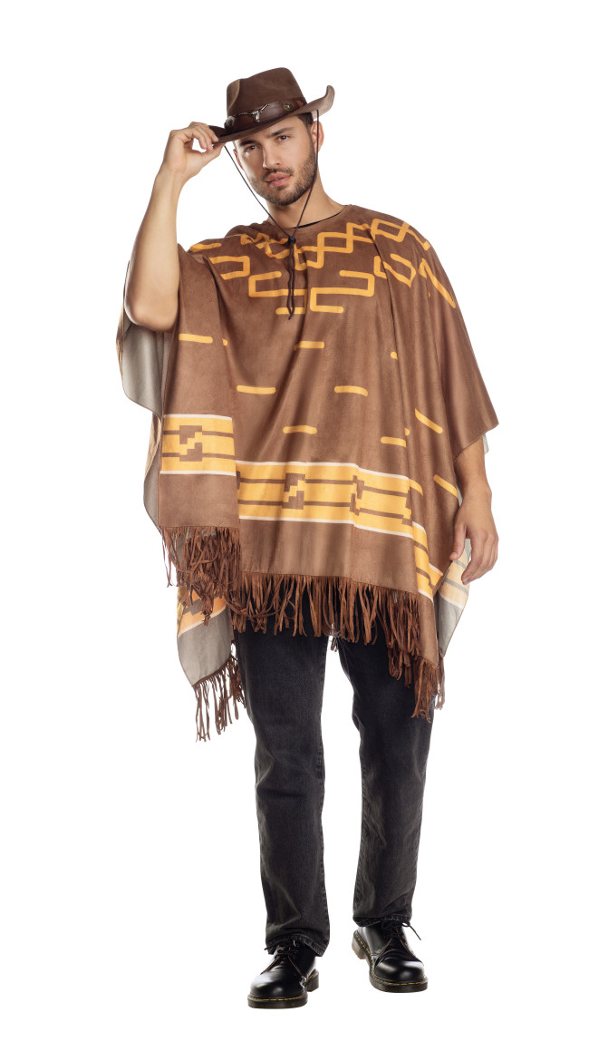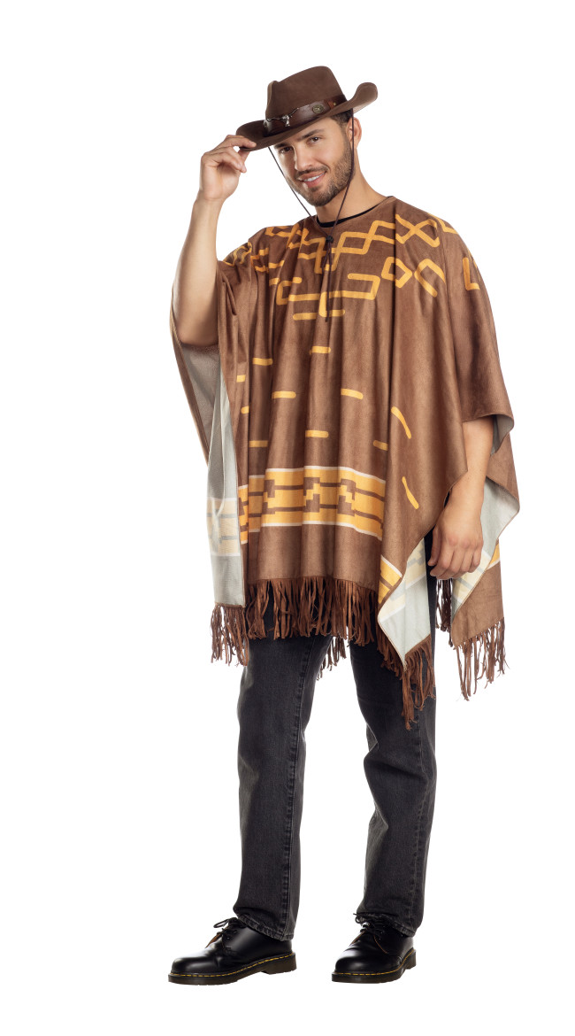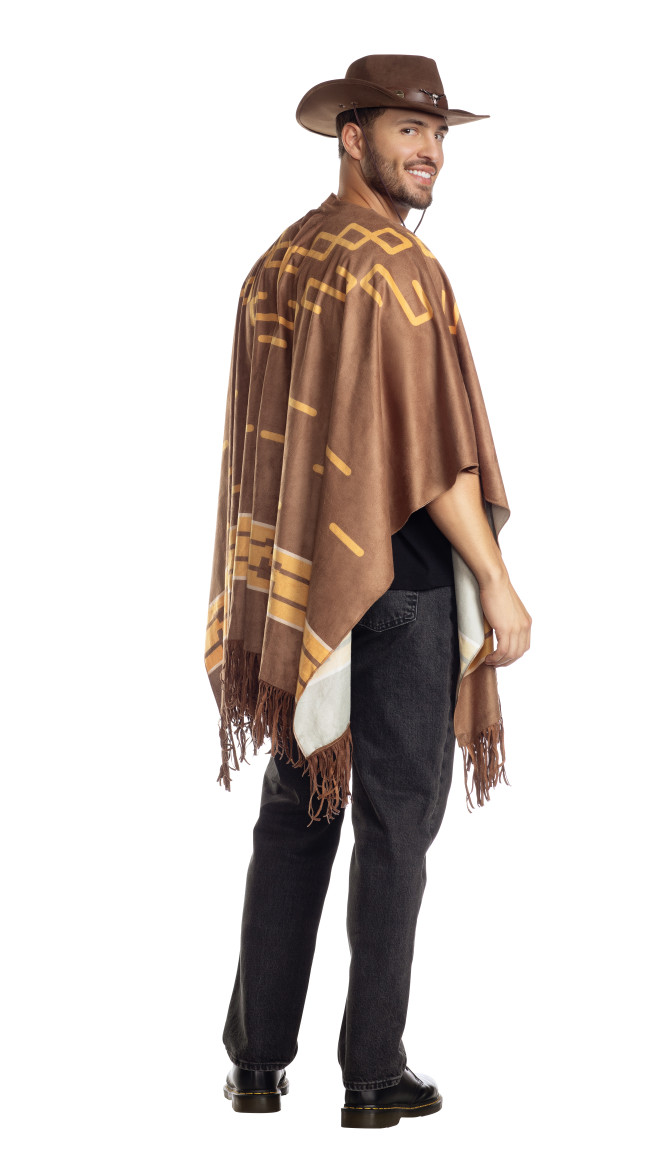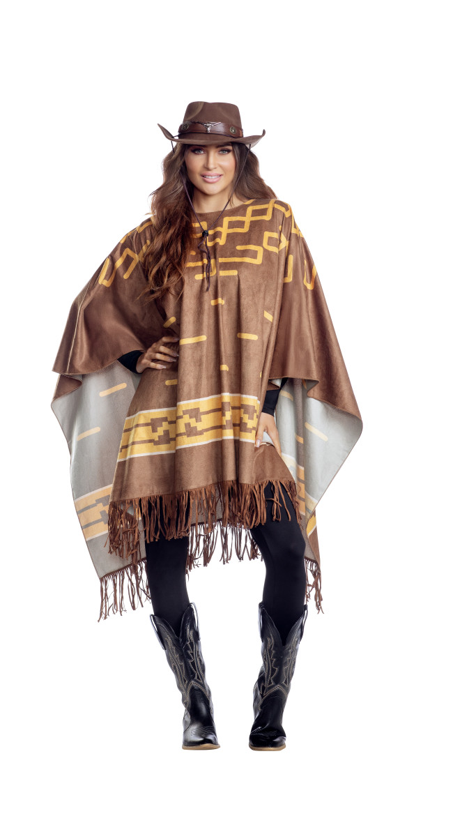 Ride into the wild west in this sultry cowgirl costume featuring a suede-look poncho with fringe trim, bold geometric print, and a tie-front neckline. Complete with a rugged cowboy hat, this fierce frontier look is ready to turn the Halloween saloon into your personal playground.