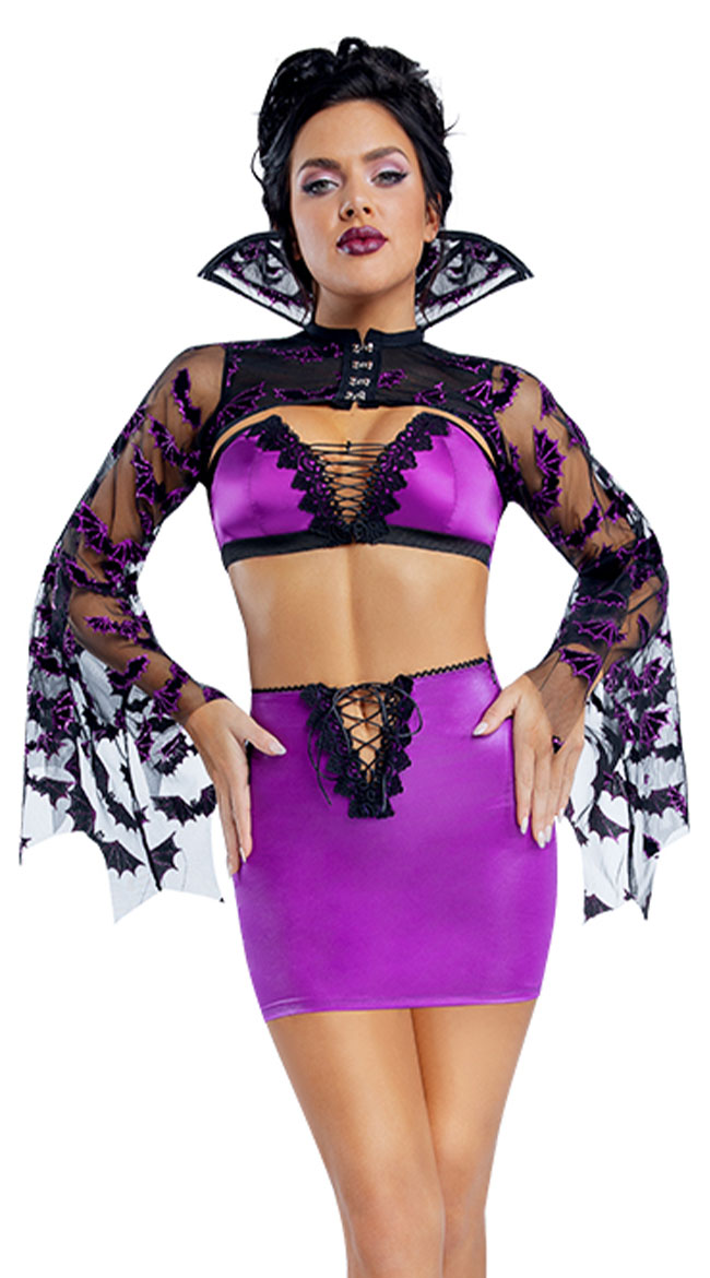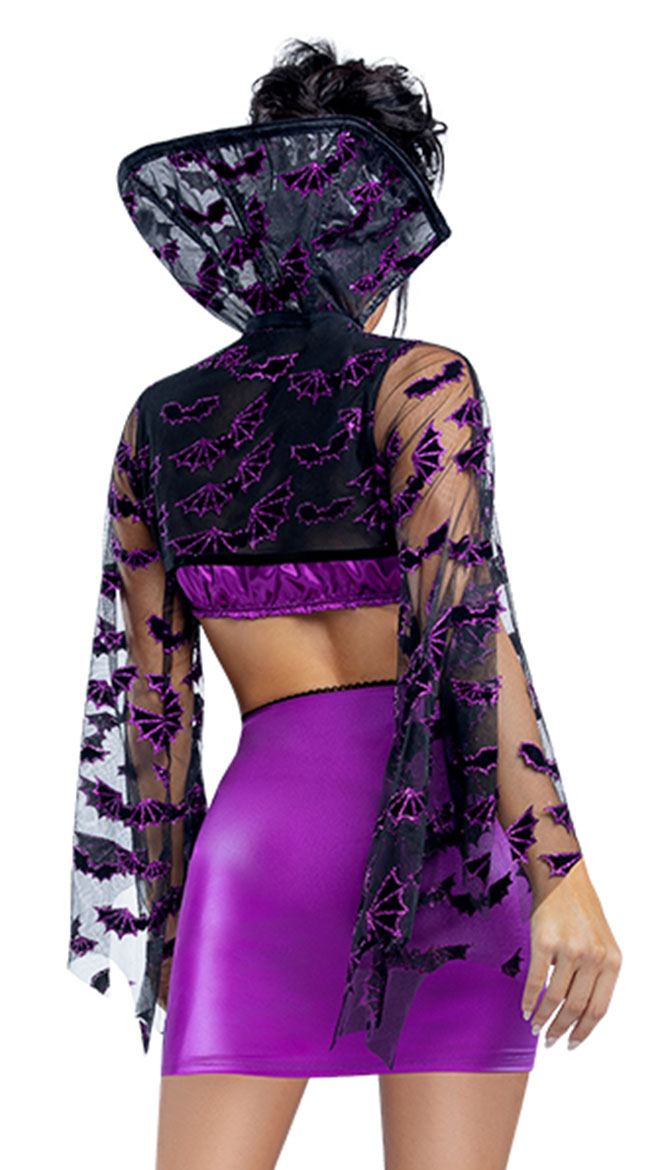 Suck on this! Live for the night life in this Vampy Vamp costume featuring a padded purple bra top with a black lace trim, a V-neckline with lace-up detailing, a ruched back band, a matching high waisted mini skirt, a sheer mesh bolero jacket with front hook closures, long draping sleeves with a jagged hem, an allover embroidered bat design, and an attached tall collar.