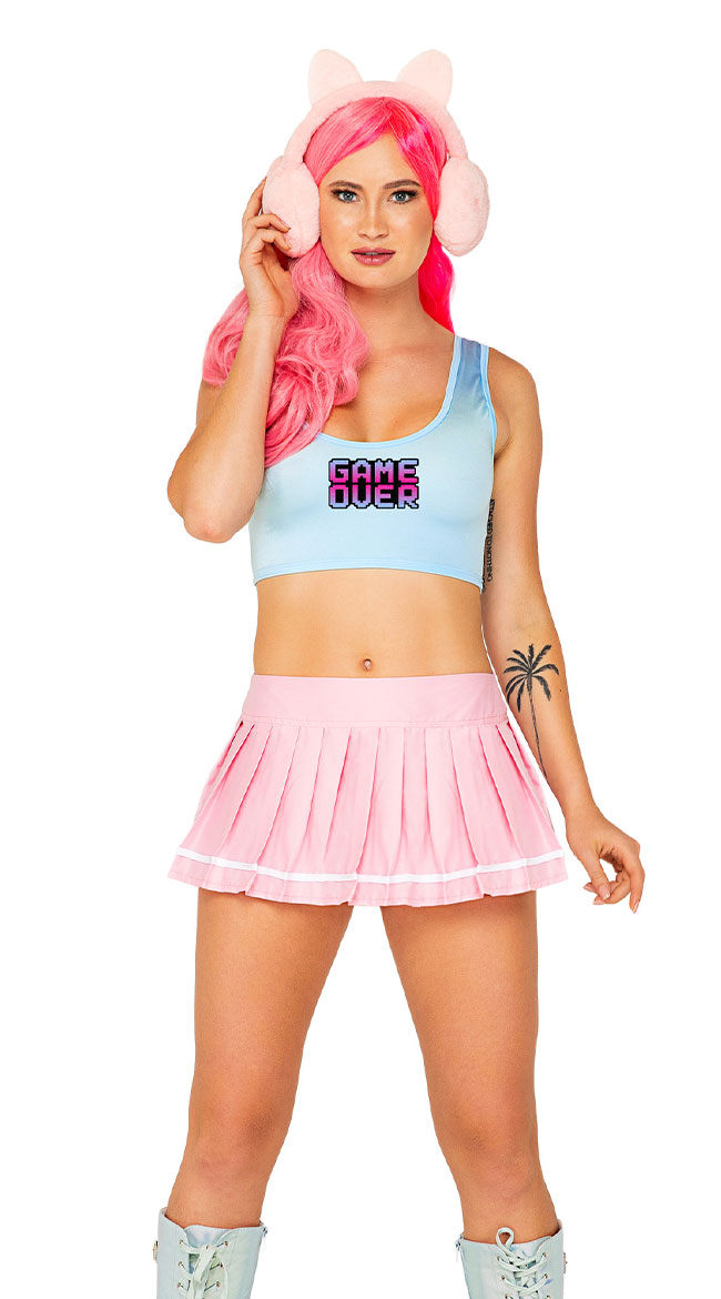 A gamer girl has entered the chat! Hit the high score in this Video Game Doll costume featuring a light blue crop top with a scoop neckline, thick shoulder straps, a "GAME OVER" screen print, a scoop back, a matching light pink pleated mini skirt with a white stripe design, and fuzzy pink faux headphones with with attached ears. (Boots and wig not included.)