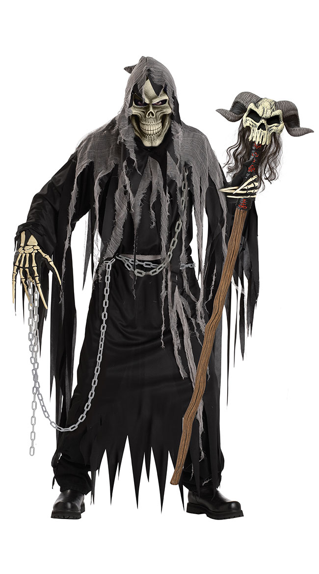 Control even the rowdiest of haywire spells with this faux textured wood staff featuring an attached faux leather wrapping, exaggerated skull with antlers, and faux hair detailing. (Staff only.)
