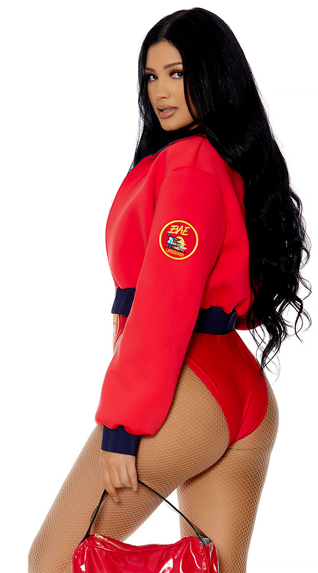 Who needs to be rescued? Make waves in this Watch Out Bae costume featuring a red bodysuit with a scoop neckline, thick shoulder straps, open side panels, a high cut leg, a cheeky cut back, an embroidered patch, a matching cropped jacket with contrast trim, a lanyard with an attached whistle, a red vinyl bag with a medic logo, and black binoculars. (Pantyhose not included.)