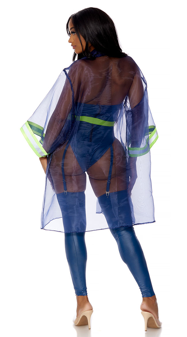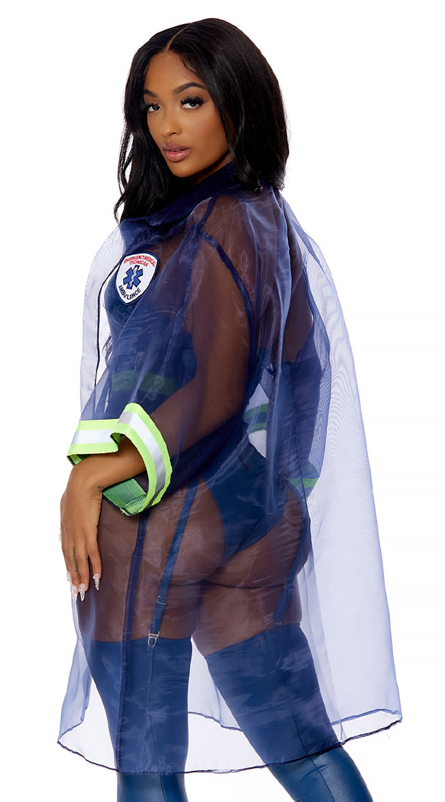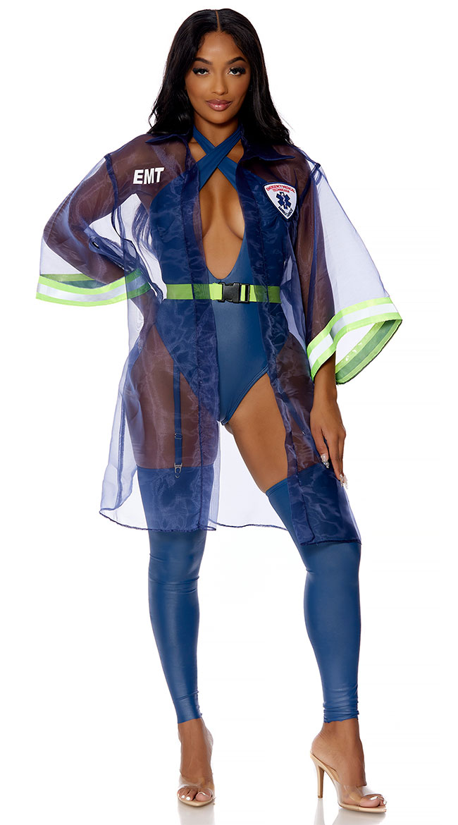 Did someone call a paramedic? Give them mouth to mouth in this What's The 911 costume featuring a blue, criss-cross halter neck bodysuit with a front cut-out, a cheeky cut back, a bright green pinch buckle belt, matching footless thigh high stockings, a sheer oversized jacket with 3/4 length kimono sleeves, medical patches, and a red vinyl bag with a cross print. (Shoes not included.)