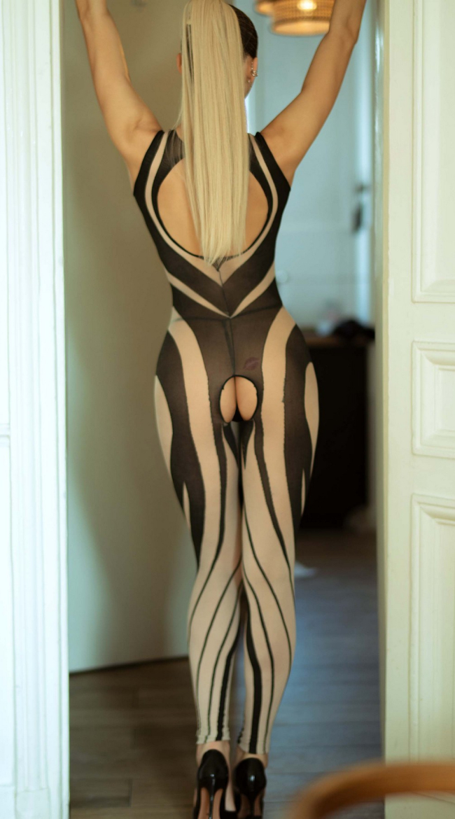 No filters. No limits. This contrast mesh bodysuit is pure power play, featuring sheer paneling that sculpts and highlights your shape with graphic precision. The halter neckline keeps it sleek up top, while the open crotch design turns the heat all the way up. Stretchy, bold, and unapologetically confident—this look knows exactly where it’s going.Wild, but intentional.