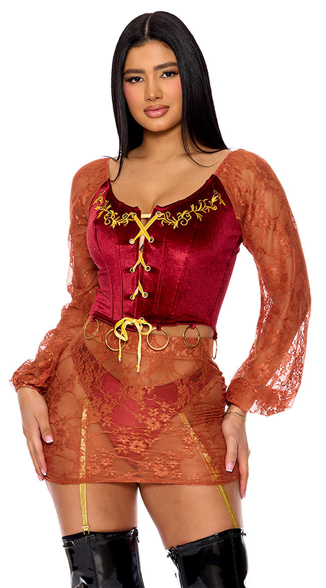 • Velvet lace-up crop top with lace balloon sleeves