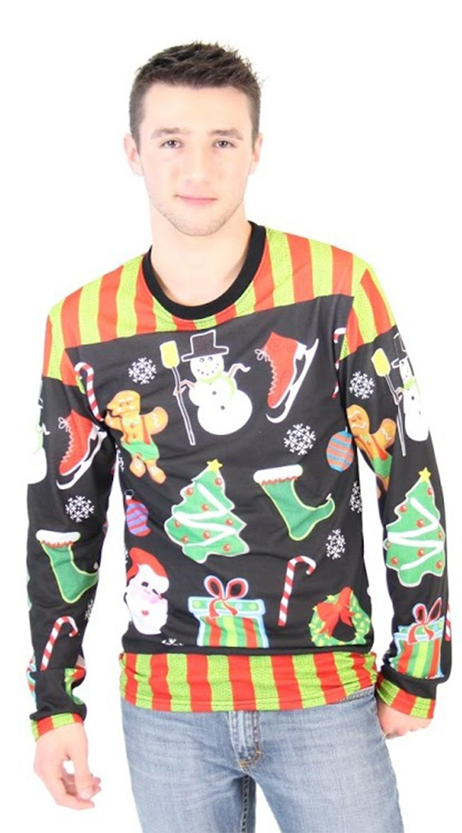 This faux ugly sweater t-shirt features every iconic Christmas print including a snowman, Santa, a Christmas tree, stockings, candy canes, ice skates and snowflakes.