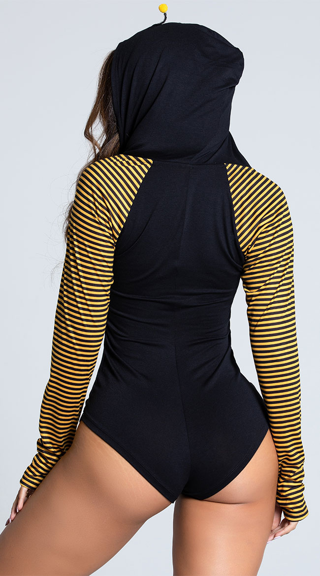 Are you ready to cozy up to the hive? Work hard for that honey in this exclusive Boo Bees Loungewear costume featuring long loose sleeves with black and yellow stripes, comfortable thumb holes, a scoop neckline with a Boo Bees retro screen print, and a cute hood with wire antennas.