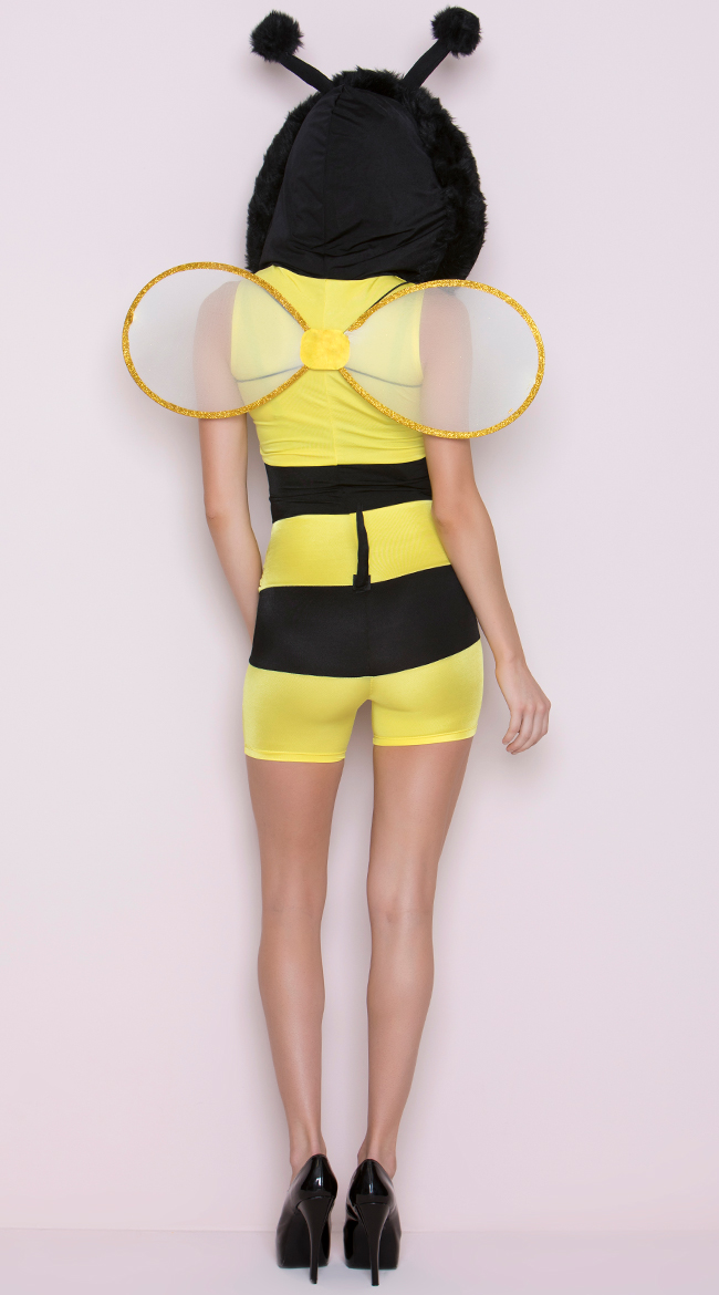 Control the colony in this exclusive Yandy Bumble Babe costume featuring a yellow and black striped romper with thick straps, a black zipper front closure, an attached black hood with faux fur lining, black antennae, attached yellow wings, and black stinger.