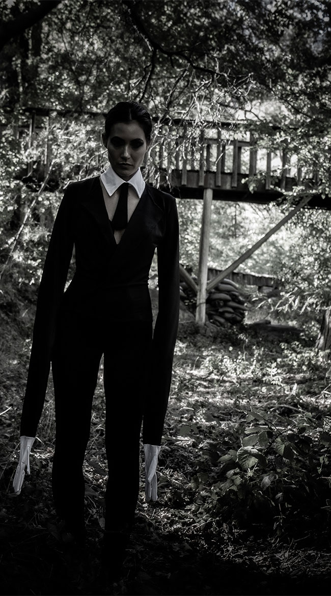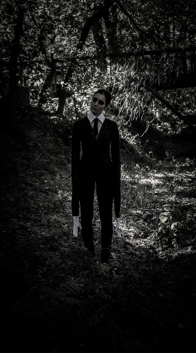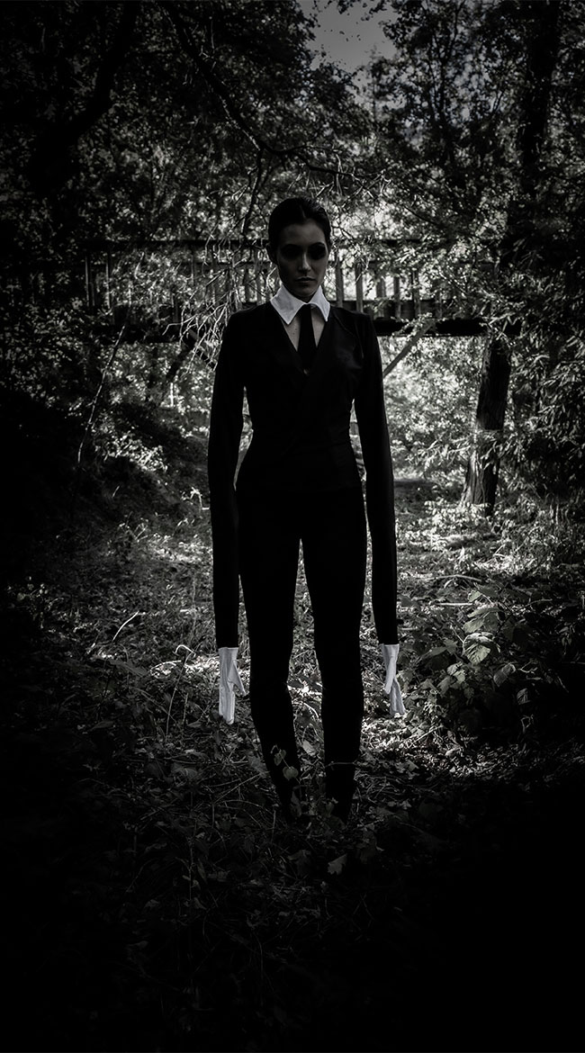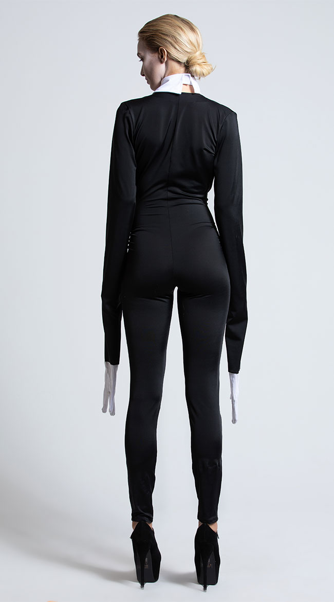 They say she's an urban legend who stalks and abducts her prey. You won't want to encounter this faceless babe in a dark forest. Straight out of the digital folklore, this exclusive Creepy Slim Man costume features a black jumpsuit with a deep V-neckline, a layered bodice, exaggerated long sleeves with arm slits, attached white gloves, and a white collar with an attached black tie.