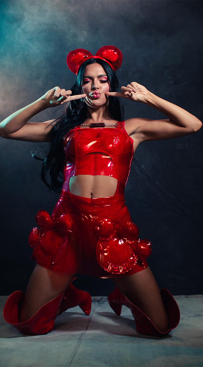 So sweet and un-bear-ably delicious. One bite of this cuddly babe will send you into a sexy, psychedelic trance. You'll be living the high life in this exclusive Edible Gummy Bear costume featuring an iridescent red vinyl bodysuit with a scoop neckline, spaghetti straps, a cut-out bodice panel, a high cut leg, a cheeky cut back, a sheer vinyl overlay top with piping details, a chain detail that says "Gummy A Bear Hug", a back zipper closure, a matching flared skirt with paw appliques, a back zipper closure, and a matching ear headpiece. (Fishnet pantyhose not included.)