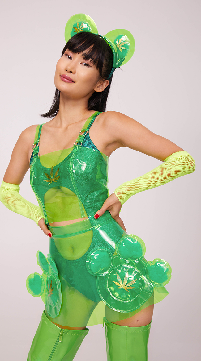 You know what time it is. You'll be living the high life in this exclusive Sexy Edible Gummy costume featuring an iridescent green vinyl bodysuit with a scoop neckline, spaghetti straps, a cut-out bodice panel, a high cut leg, a cheeky cut back, a sheer vinyl overlay top with piping details, a pot leaf decal, a back zipper closure, a matching flared skirt with paw appliques, pot leaf decals, a back zipper closure, and a matching headpiece with pot leaf embellished ears. (Gloves not included.)