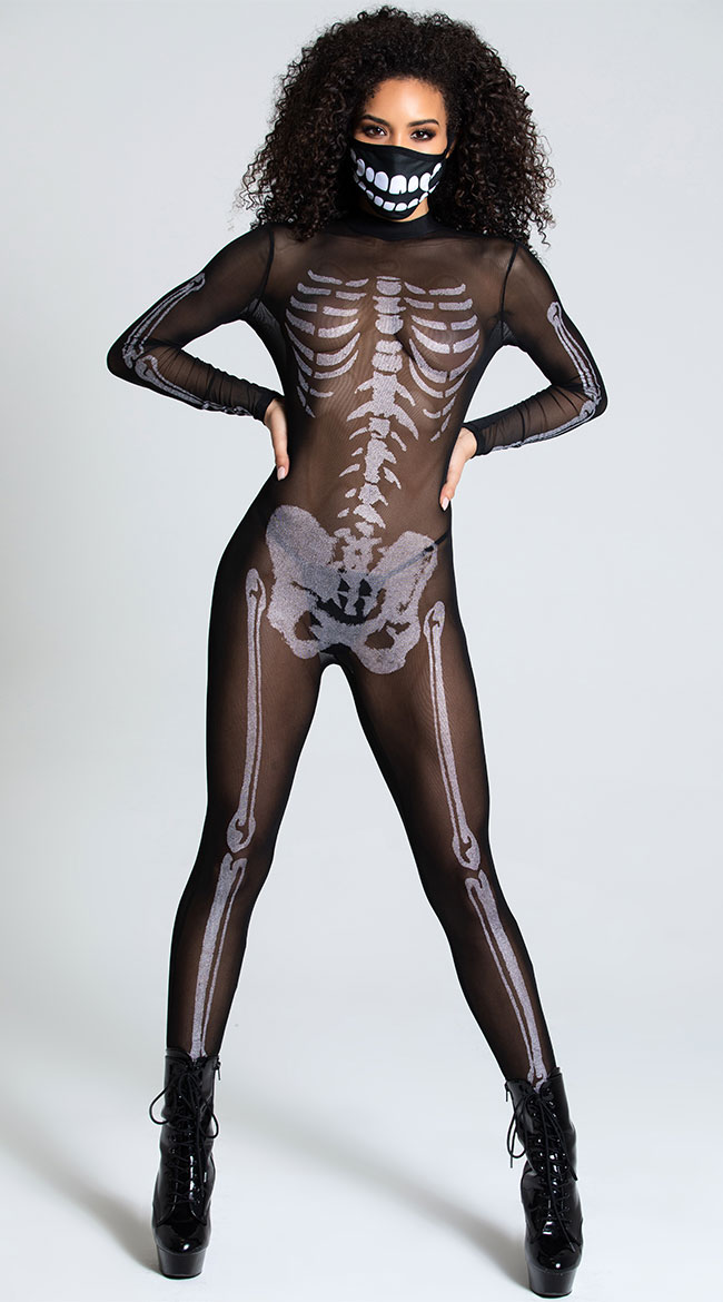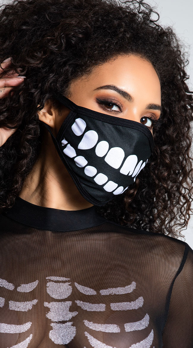Are you scared sexy? Sink your teeth into this exclusive face mask featuring a white skeleton teeth print, a black trim, comfortable ear loops, and a lined interior. Pair with any sexy skeleton costume to complete your deadly look! (Skeleton costume not included.)