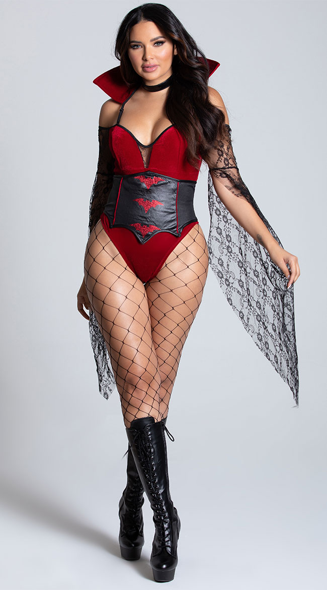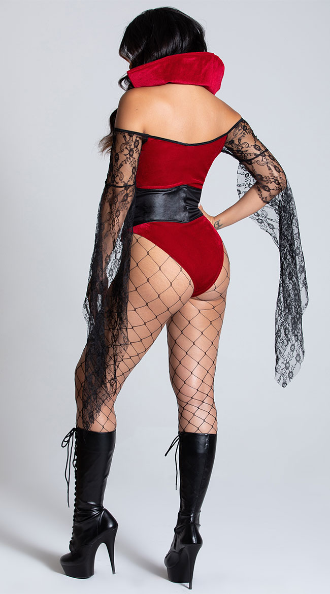 Satiate your thirst and quench it with crimson. Delight your blood-thirsty cravings in this exclusive Scarlet Slayer Vampire costume featuring a velvet bodysuit with adjustable spaghetti straps, a criss-cross center bust panel, off-the-shoulder long draping lace sleeves, an adjustable/removable stand collar, and a bat decal waist cincher. (Tights not included.)