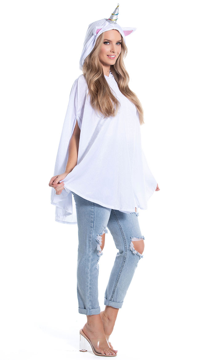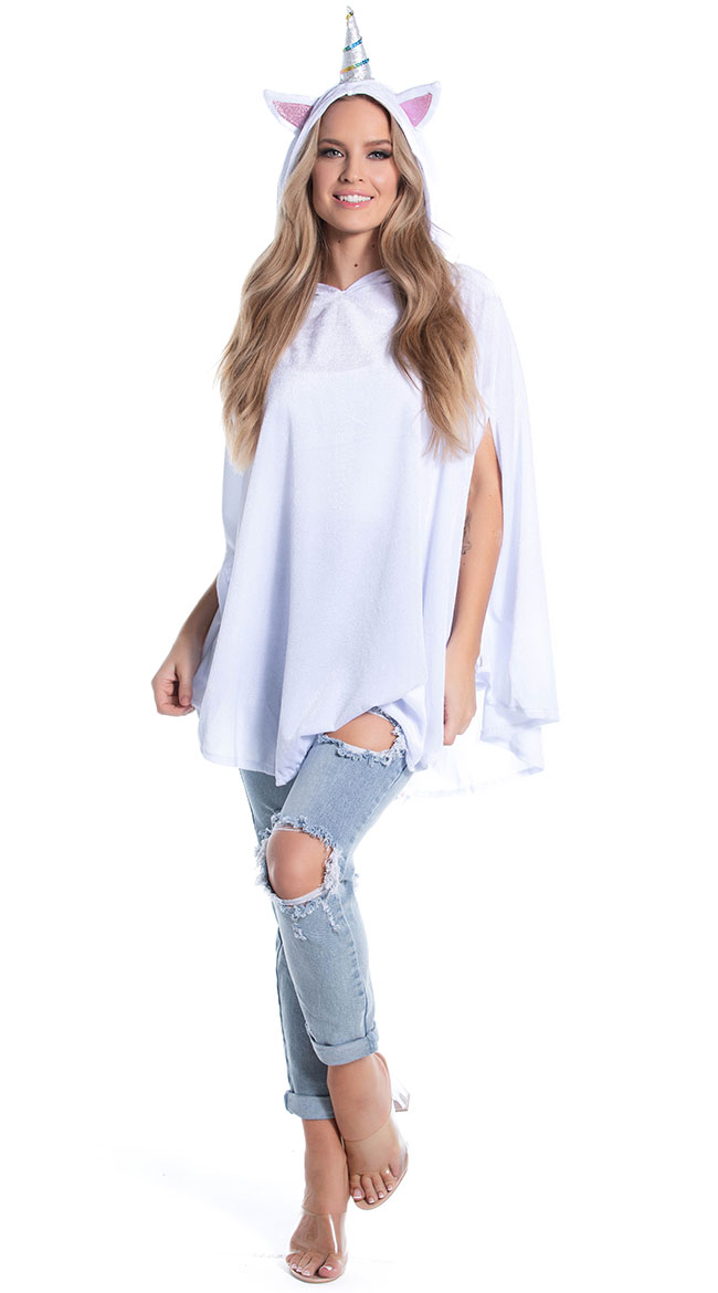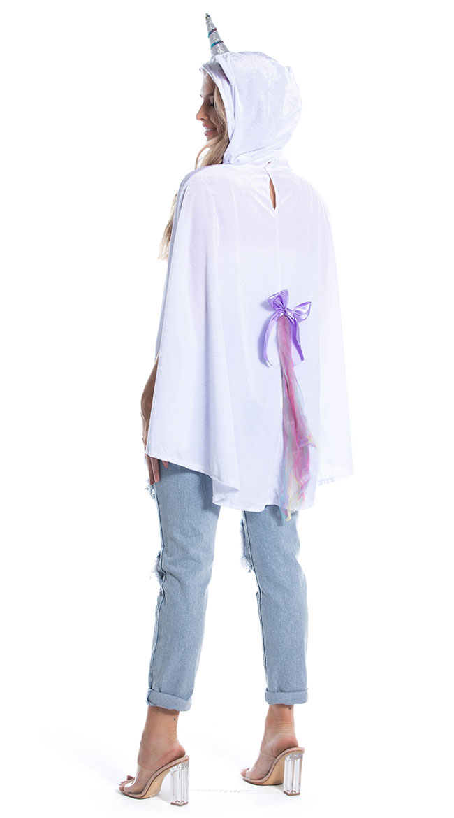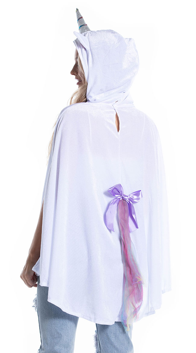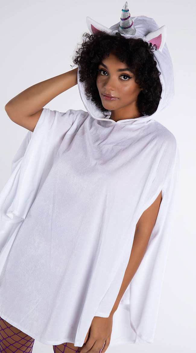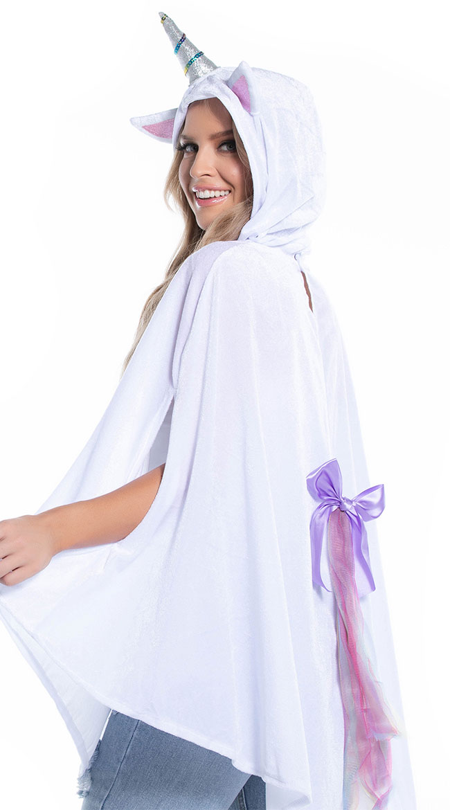 You'll be dreaming in rainbows and glitter all day long, babe. Look cozy and cute in the exclusive Unimaginable Unicorn costume featuring a white velour poncho with arm slits, an oversized hood with ears, a silver horn with glitter accents, and a multi-color tail with a purple satin bow. (pants, hosiery, and shoes not included.)