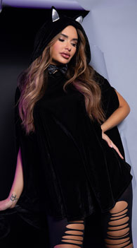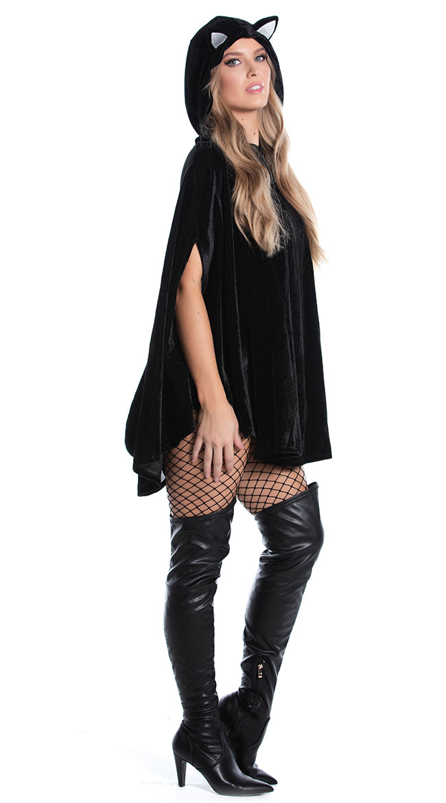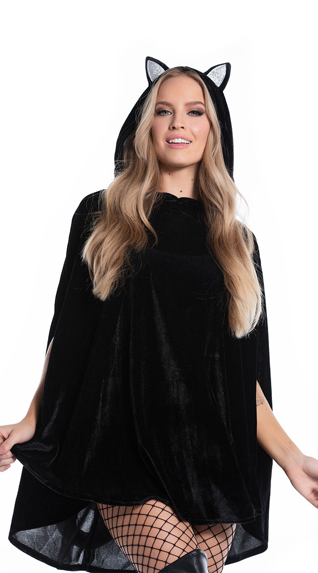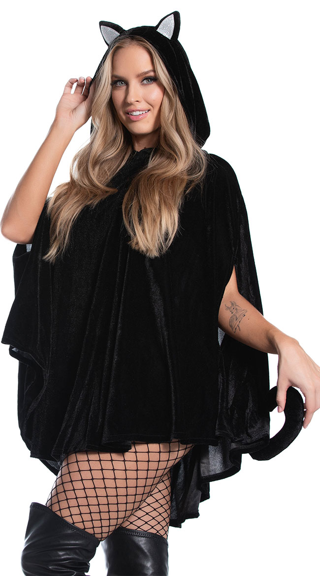 Shake off that catnip! Did someone call you a "Childless Cat Lady"? Don't have any bad blood while you rock this one size velour poncho with arm slits, an attached hood with ears, a coiled cat tail and matching satin bow tie choker. Don't forget to vote! (Fishnet stockings and boots not included.)