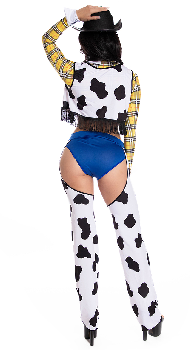 • Blue cheeky shorts with cow print chaps