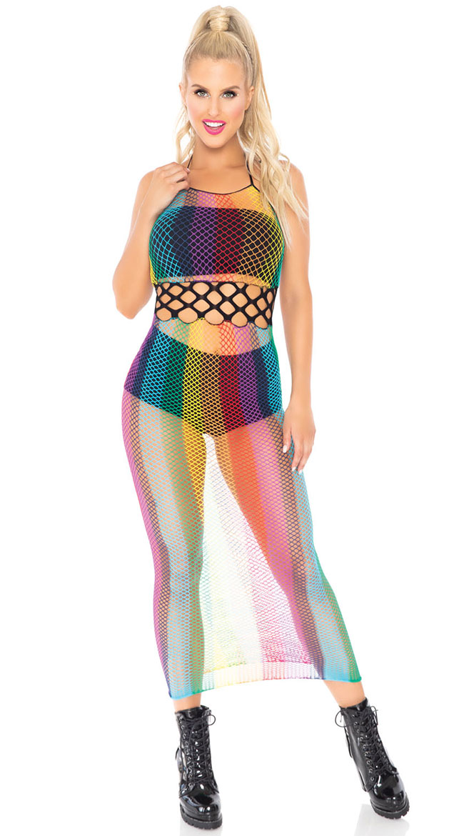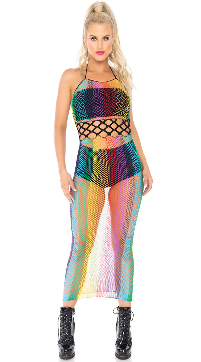 Give a taste of sexy to your honey in this stunning fishnet dress featuring sheer fishnet cups, a high neckline with halter straps, a cut-out netted waist detail, multicolor vertical stripes, and a midi length. (Panty not included.)