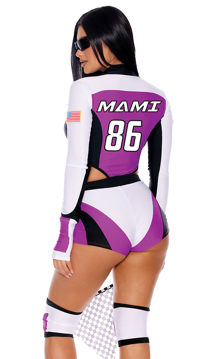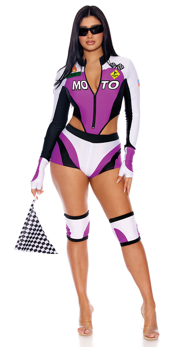 Take the lead in this Ready to Race costume featuring a multi-colored bodysuit with long sleeves, a front zipper closure, "MOTO" printed on the bust, racer patches, cut-out sides, "MAMI 86" printed on the back, a cheeky cut back, matching fingerless gloves, matching knee bands, and black glasses. (Flag not included.)