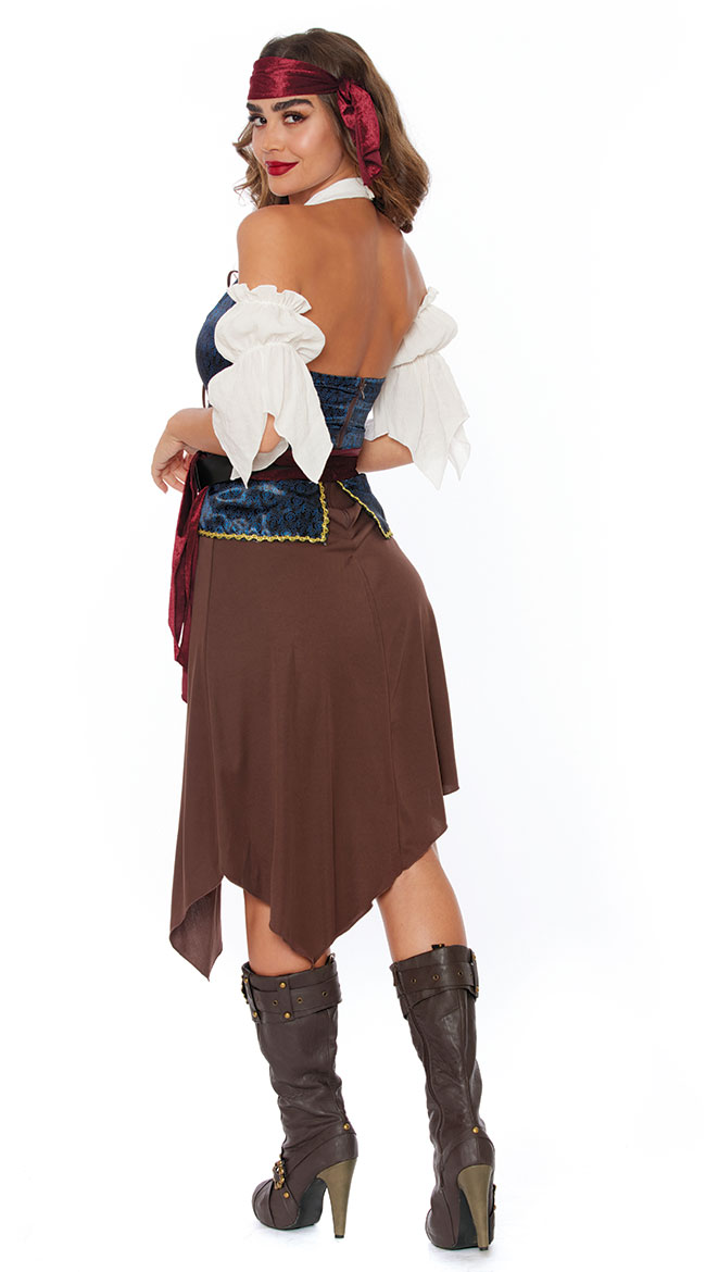Work the plank in this Rogue Pirate Wench costume featuring a gauze top dress with a lace-up V-neckline, a velvet blue vest panel with a gold trim, a brown skirt with a front slit, detached gauze sleeves with puffs and draping details, a red velvet waist sash, a faux leather belt with a gold buckle, and a velvet head sash.