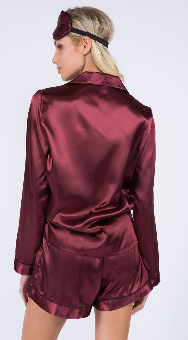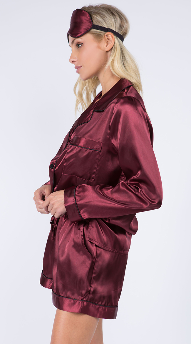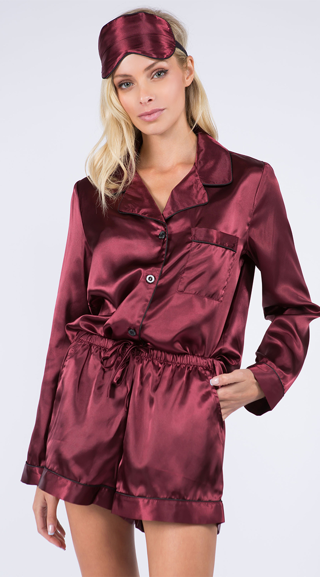 Sleep in luxury in this satin pajama set featuring a top with long sleeves, a front pocket, front button closures, matching high waisted shorts, and a matching eye mask.
