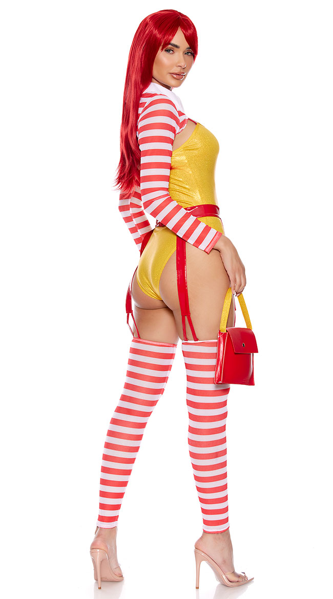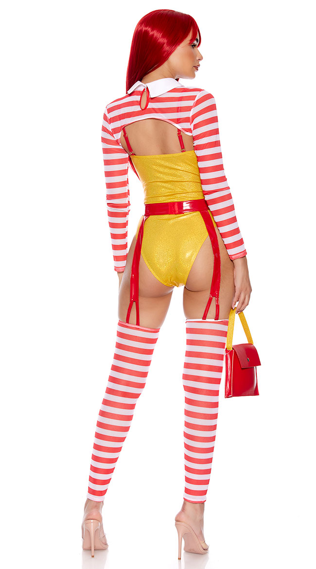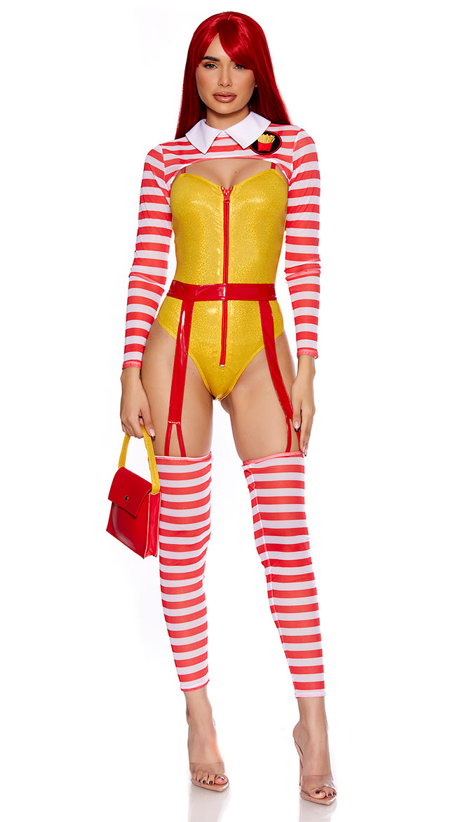 Be a tastier snack than the golden arches in this Size Me Up Fast Food costume featuring a yellow vinyl romper with a sweetheart neckline, red adjustable spaghetti straps, a front zipper closure, a cheeky cut back, a sheer red and white striped bolero with long sleeves, white lapels, a french fry patch, a red garter belt with a hook and eye back closure, strappy garter straps, matching footless leggings, and a red mini purse with a yellow strap. (Wig not included.)