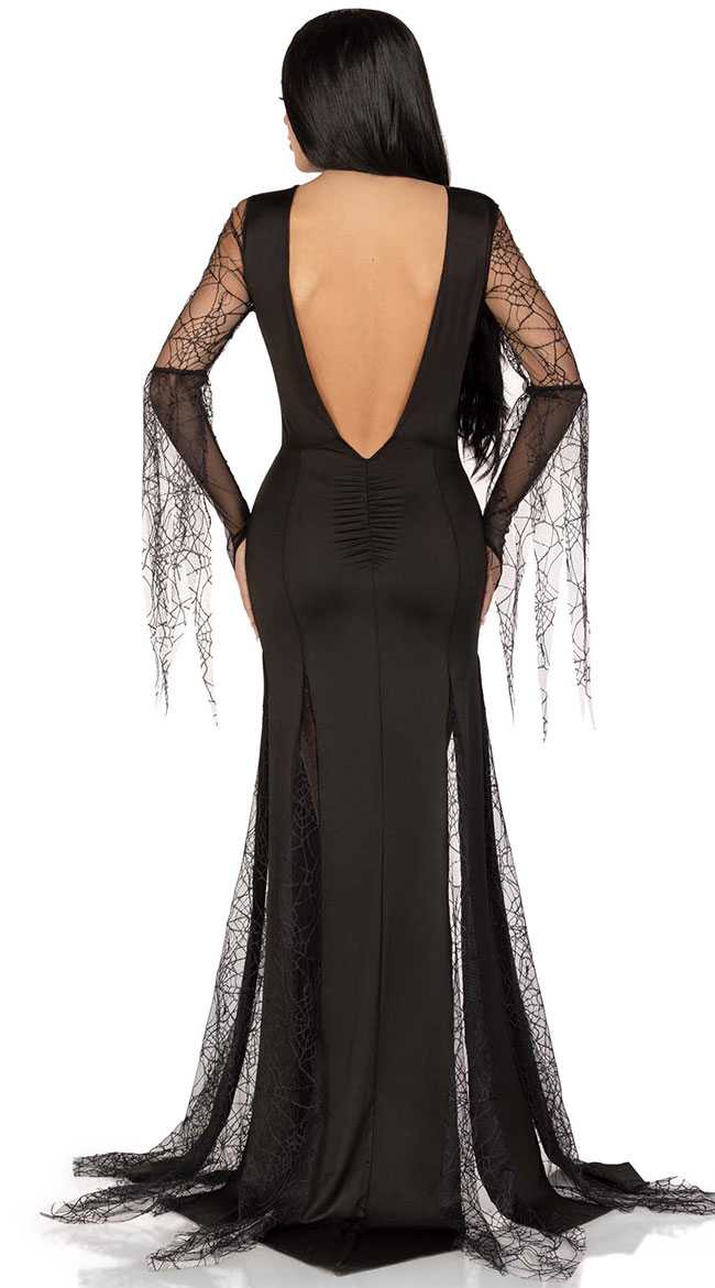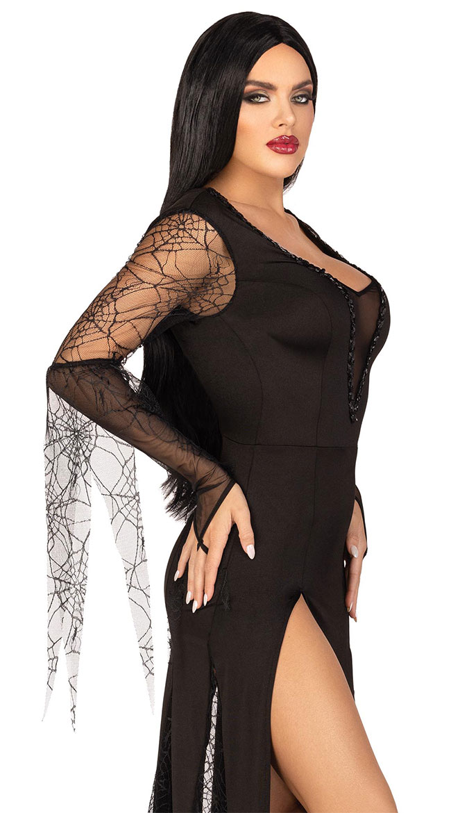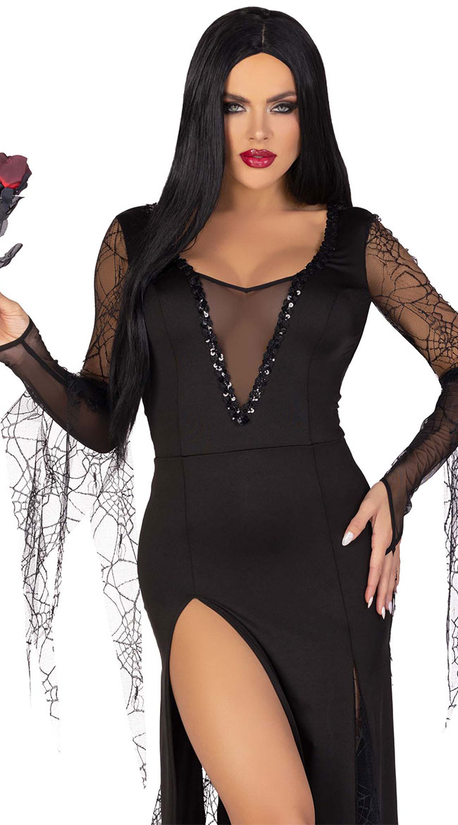 Spend eternity with your love in this Spooky Beauty costume featuring a black dress with a sheer mesh V-neckline, a sequin trim, long spiderweb sleeves with draping pieces, a deep V-back, a ruched back, a long skirt with a high front slit, draping spiderweb pieces, and mesh fingerless gloves. (Wig not included.)