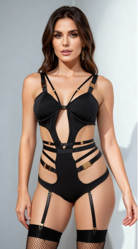 Wrap your lover in your arms in this sexy teddy featuring tricot stretch underwire cups with gold buckle hardware, a strappy chest harness, thick shoulder straps, a keyhole cut-in bodice with multiple strappy waist details, adjustable garter straps, and a thong cut back. (Thigh high stockings not included.)