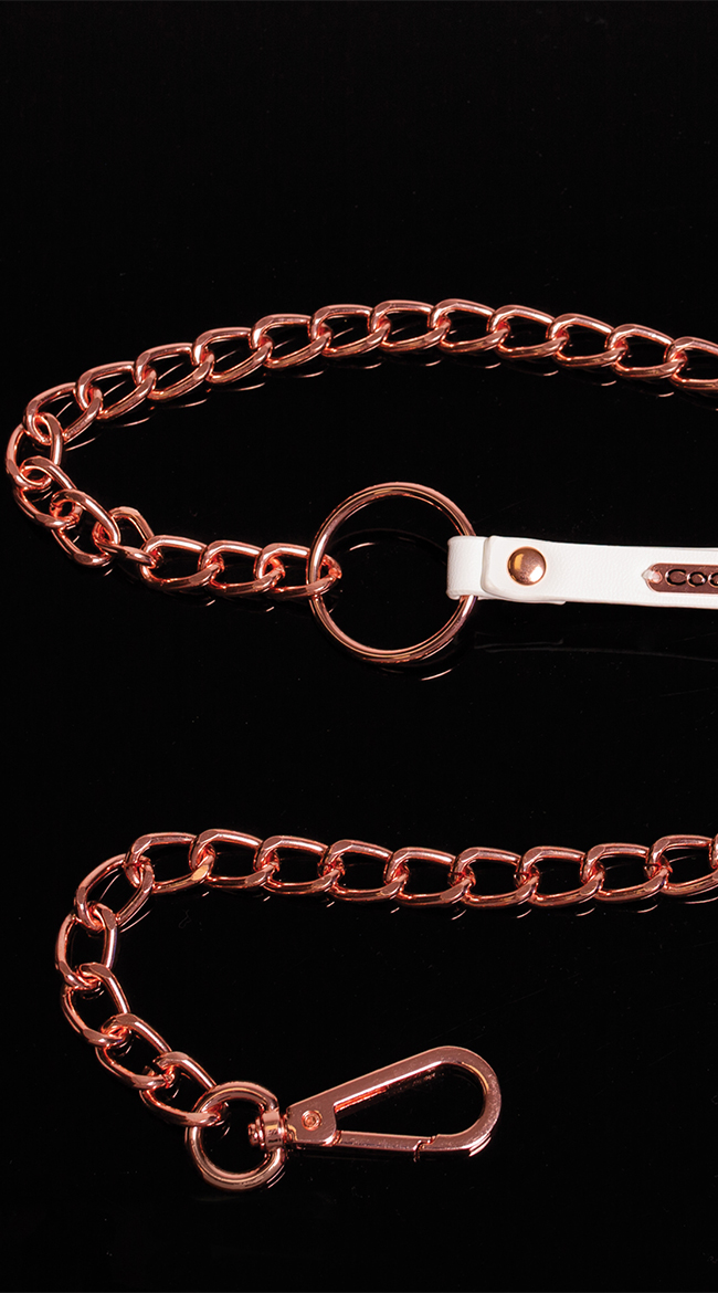 Give in to your every desire with this provocative leash featuring a black handle with rose gold plating, a removeable O-ring accent, and a rose gold chain with an attached clip. (Leash only.)