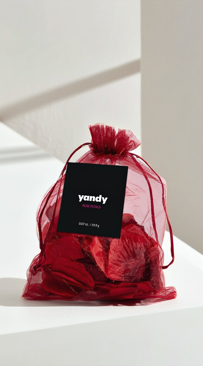Elevate the romantic vibes with these exclusive artificial red rose petals packaged in a sheer, red organza bag with adjustable drawstring tie.