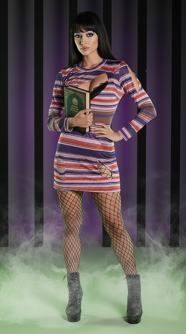 A star is born in Yandy's Goth Daughter Costume. This easy costume features a striped dress with a few sexy slashes. Wear your own bra under this dress and style it with fishnets and boots. You will make your mark on history!