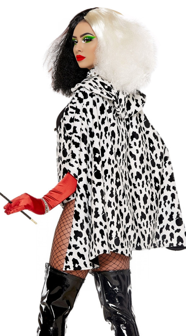 Hunt your spotted prey in this DeVilish Storybook Villain costume featuring a velvet bodysuit with a high neckline, a Dalmatian printed panel, gold button accents, a cheeky cut back, a black and Dalmatian printed cape with a gold chain, long red gloves ,and a cigarette holder. (Pantyhose and wig not included.)