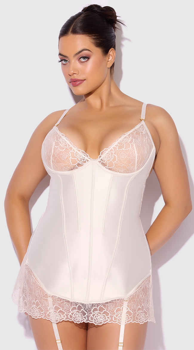 • Micro-mini slip with see-through wired cups and an open-back lace hem